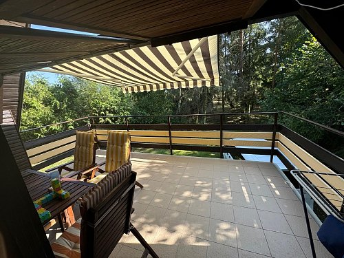 Posezení na terase je z teakového dřeva včetně stolu, které v letním slunci chrání výsuvná markýza.
